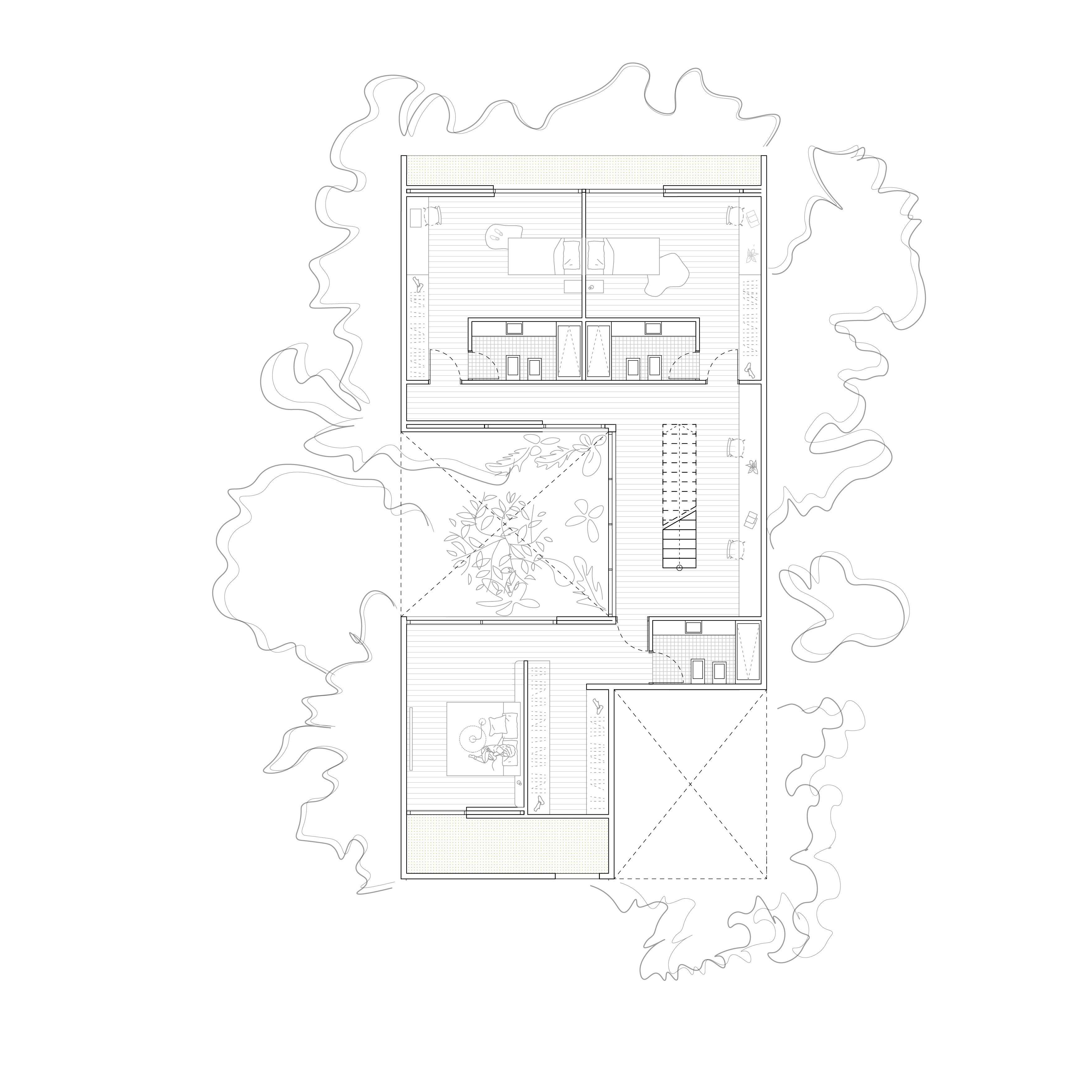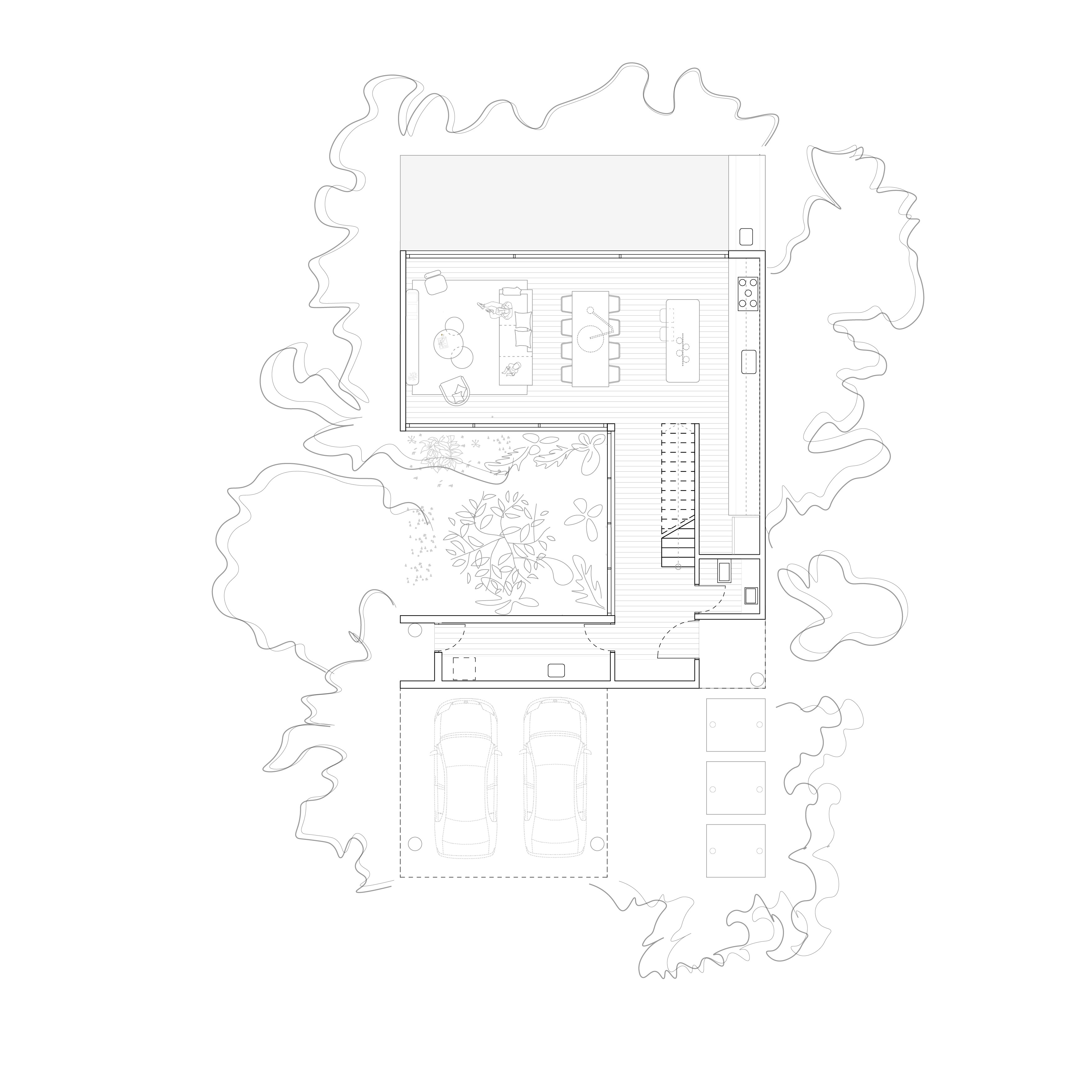 El diseño se centra en un patio central, cuyas aberturas se disponen para mantener siempre la vista hacia el entorno natural.