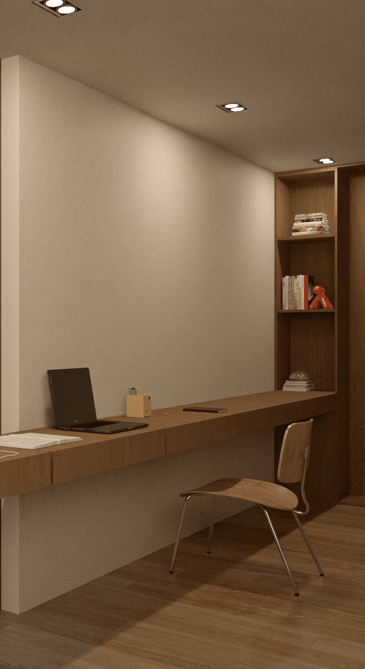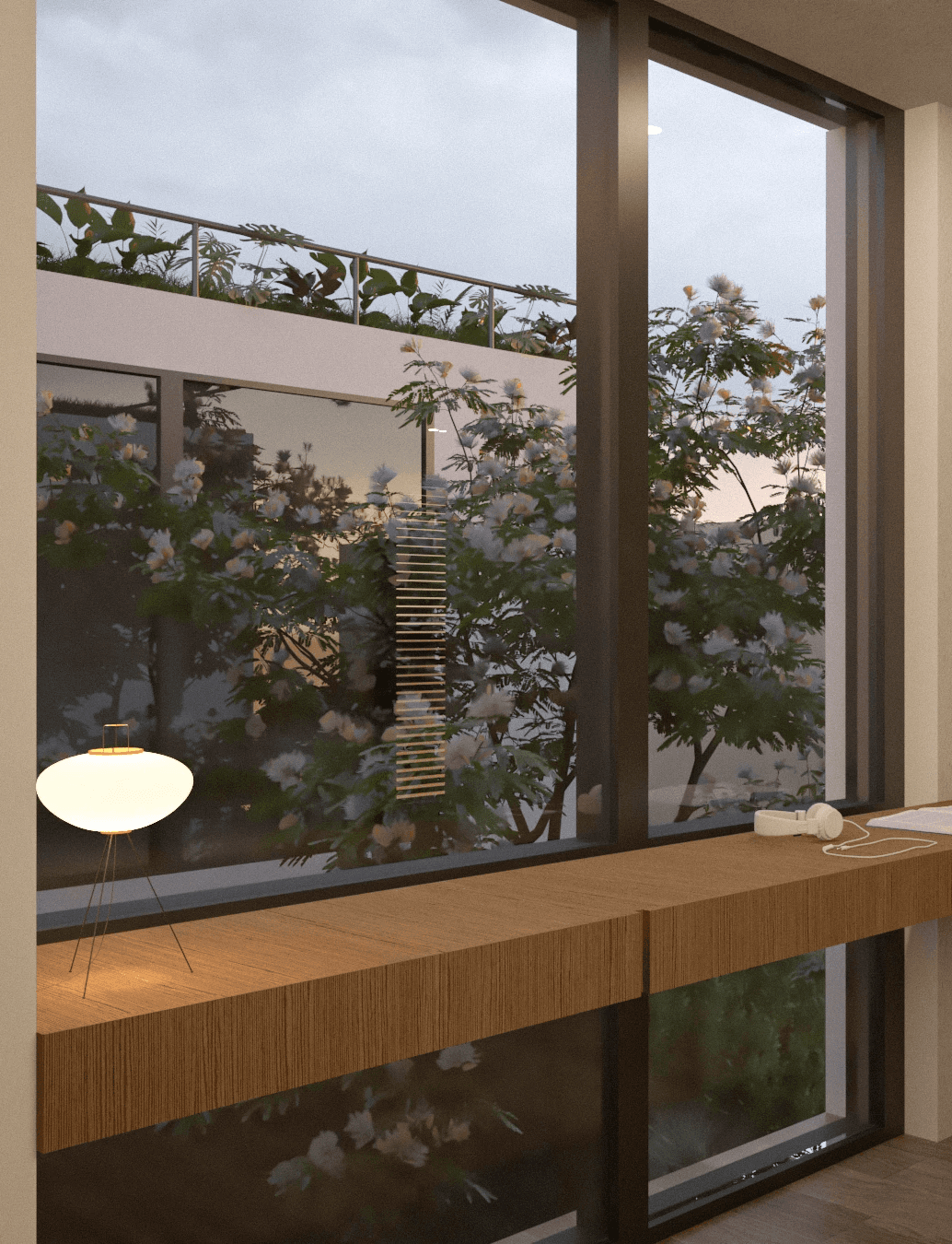 Un muro macizo con una única abertura se orienta hacia el noroeste, enmarcando una vista panorámica hacia la montaña y permitiendo la entrada de luz natural, fortaleciendo así la conexión visual con el paisaje.