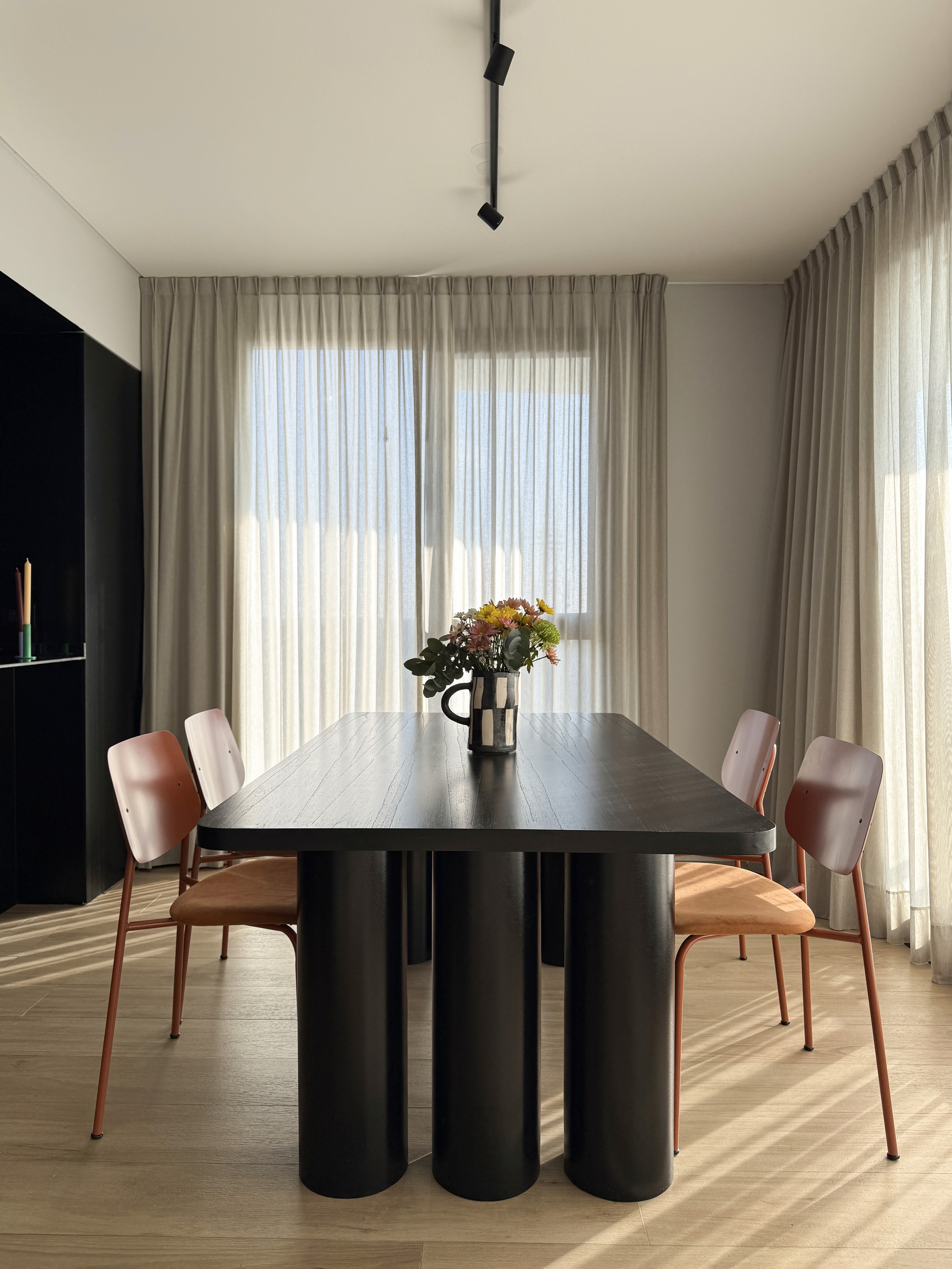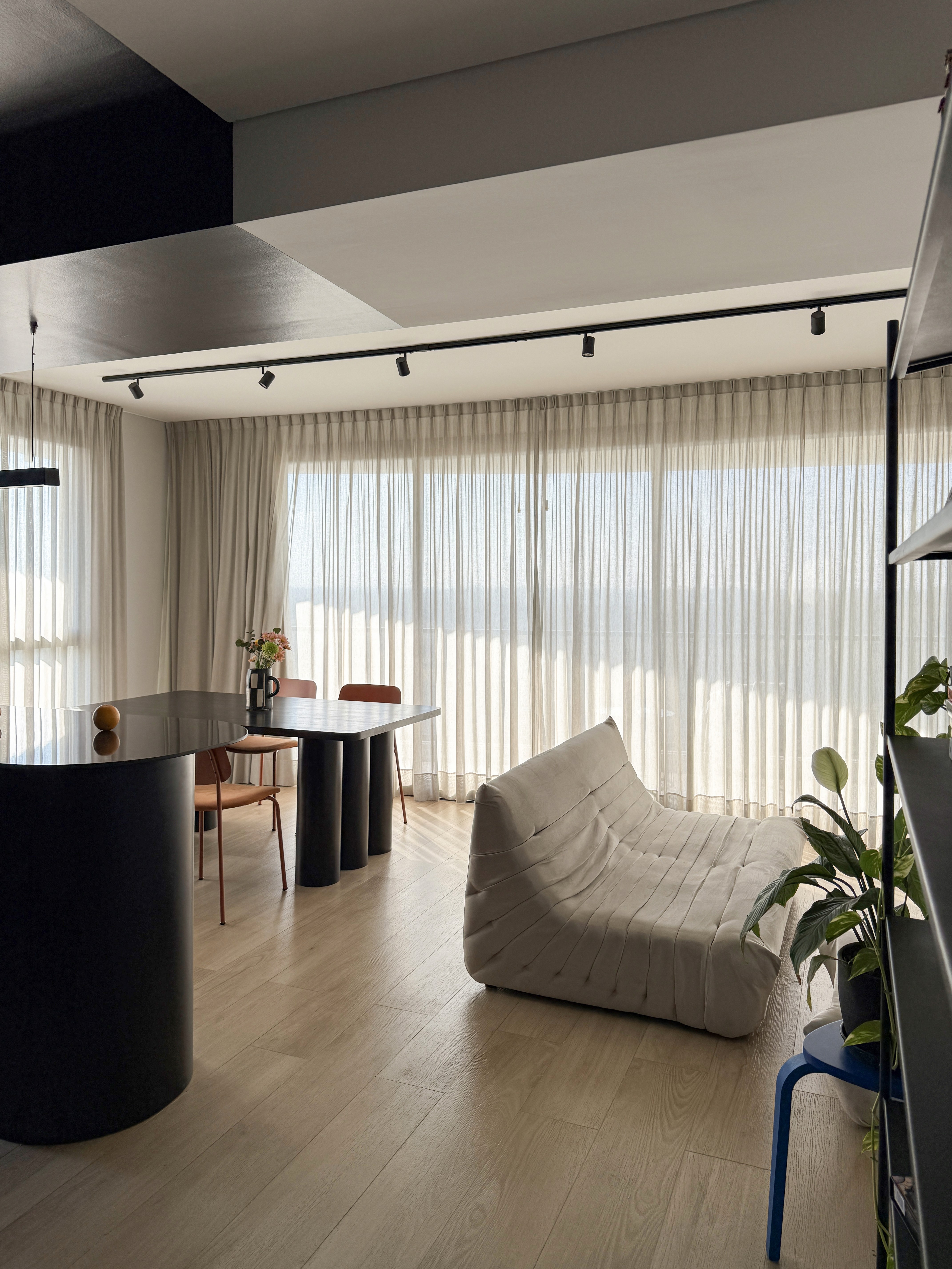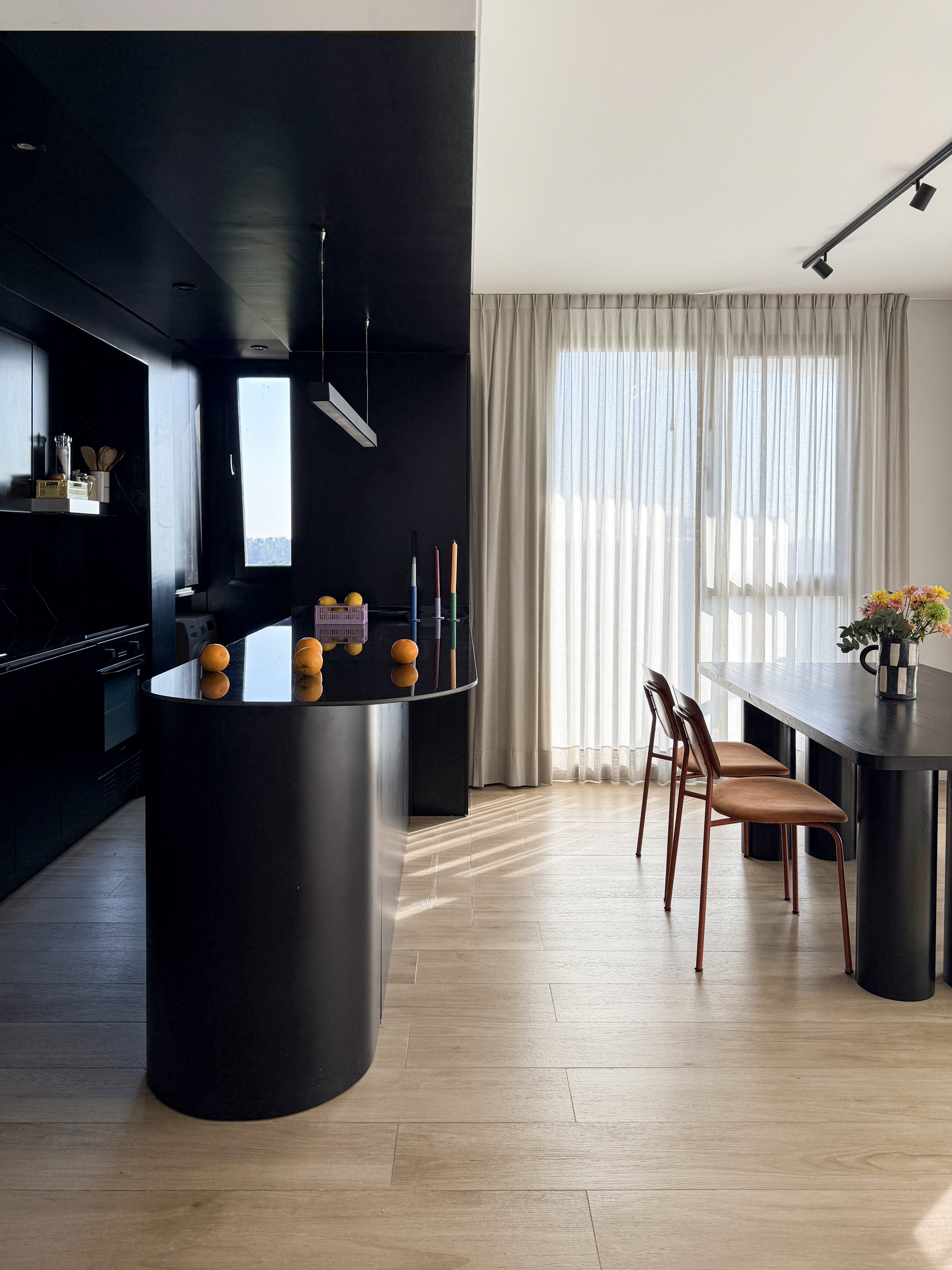El proyecto buscó reflejar la personalidad del cliente a través de una paleta monocromática en blanco y negro. La cocina, concebida como un punto de contraste, introduce el negro con fuerza, marcando identidad. El resto del espacio retoma esos tonos con mayor sutileza, complementándolos con mobiliario y detalles decorativos que aportan carácter y coherencia.